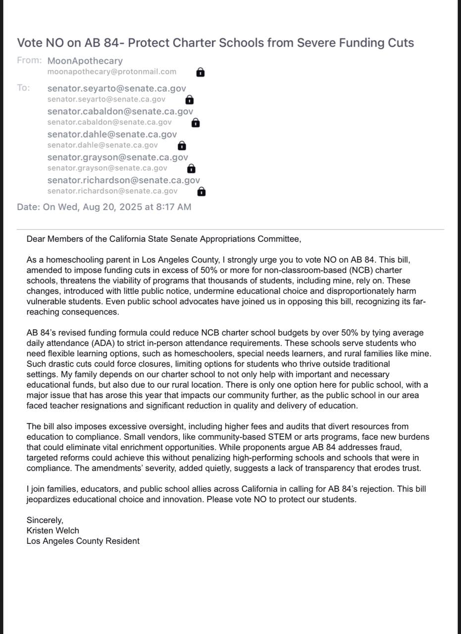 We have until September 12, 2025 to bury this thing. Here is what you can do… you do not have to be a resident of California, nor do you have to have kids in school or even be a part of a charter school to voice your opposition. Here is a copy of the letter I drafted. Please feel free to use this as a template, highlighting your own situation or your thoughts about this bills’ proposed implications. Use this to tell your story!