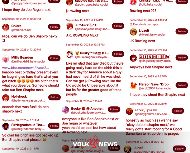 Wave of Threats Targets Public Figures on Bluesky After Kirk Assassination Johnny Doomsayer September 11, 2025 Leave a Comment on Wave of Threats Targets Public Figures on Bluesky After Kirk Assassination Posted in Antifa, Terrorist Attacks, Trans Problem, Trans Problem On Blusky app there are people asking for the next person to be targeted. These include JK Rowling, Matt Walsh, Trump, Ben Shapiro, Libs of TikTok, Elon Musk, and Andy Ngo. Below are collected screenshots. – – – Also see: Charlie Kirk Assassination Data Author: Johnny Doomsayer