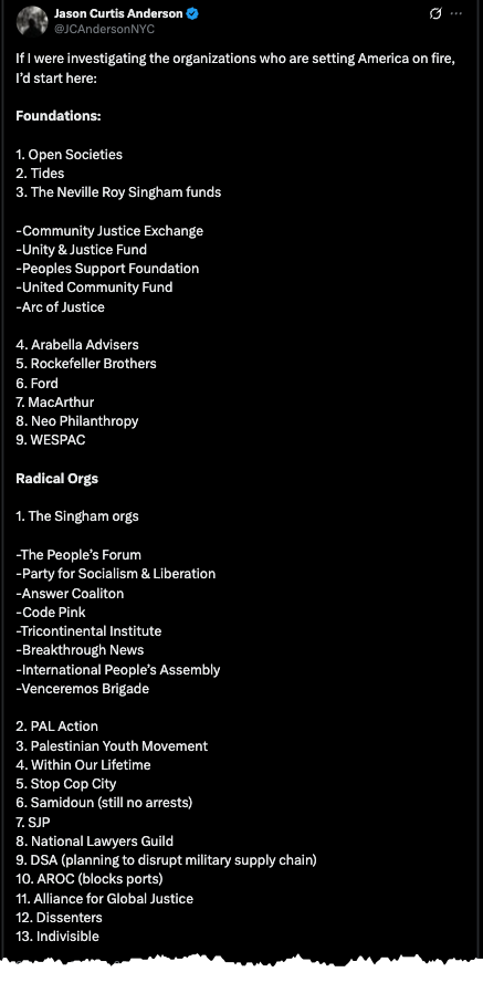 Anderson’s cheat sheet to better understand “the orgs who are setting America on fire” that should be investigated first includes: