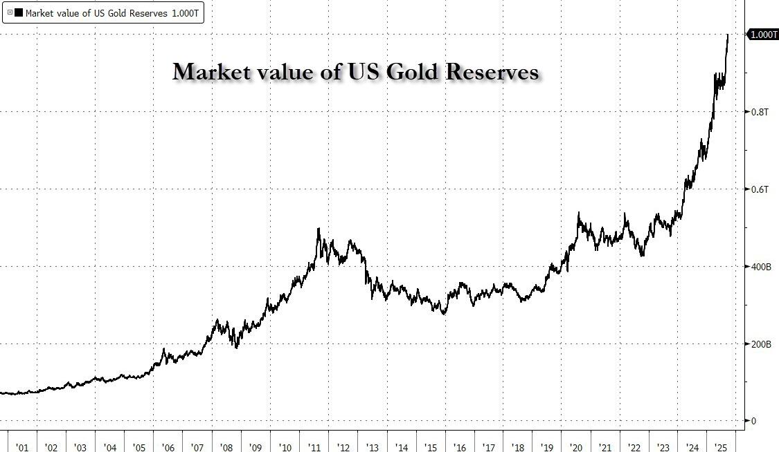 On the back of a 45% surge in the price of gold this year, the US Treasury’s hoard of the barbarous relic has surpassed $1 trillion in value for the first time in history.
