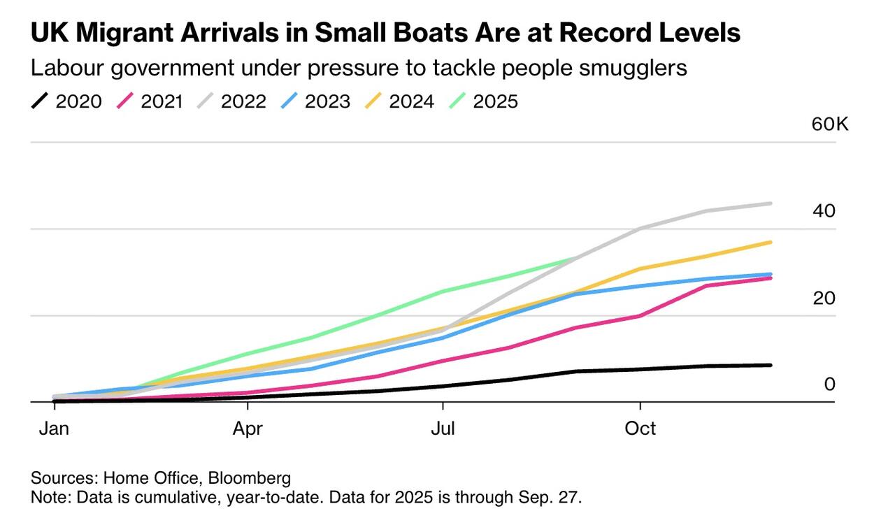 The UK recorded its largest-ever migrant crossing on a single vessel this weekend, according to Bloomberg – piling further pressure on Prime Minister Keir Starmer as his Labour Party convenes for its annual conference in Liverpool.