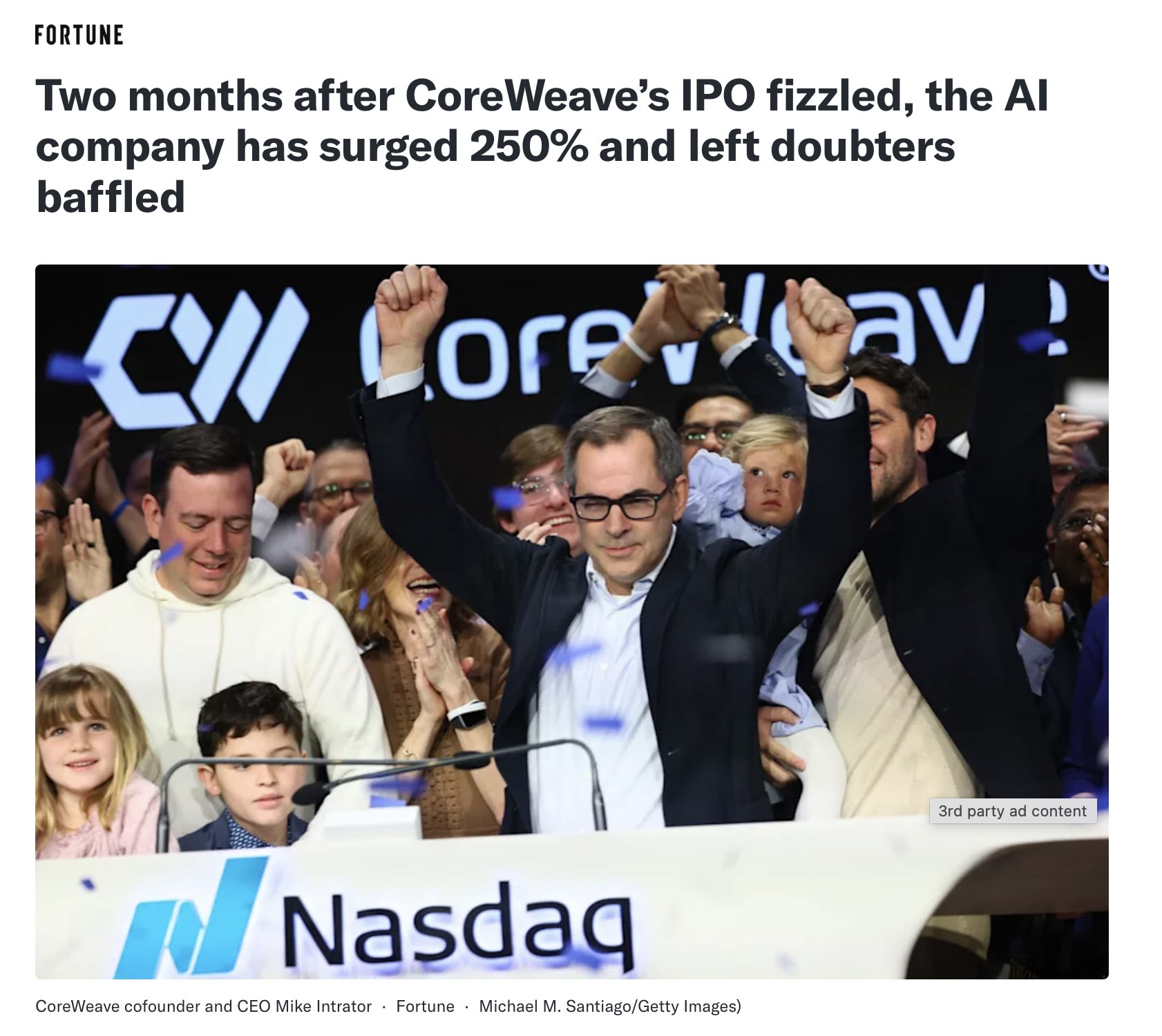 I’ve said before that I wasn’t sure AI was a bubble. But with CoreWeave’s failed IPO magically tripling in months, with Nvidia underwriting its own customers, and now with this talk of chip leasing, I’ve changed my mind. This is what bubbles look like — distorted incentives, circular economics, and financial engineering that papers over weaknesses.