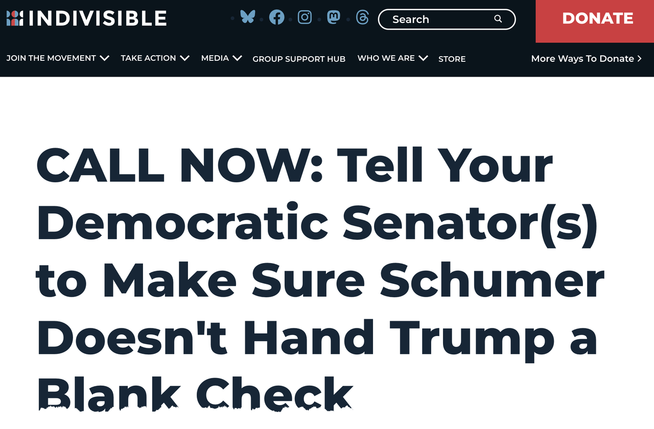 “CALL NOW: Tell Your Democratic Senator(s) to Make Sure Schumer Doesn’t Hand Trump a Blank Check,” far-left activist group Indivisible wrote on its website.