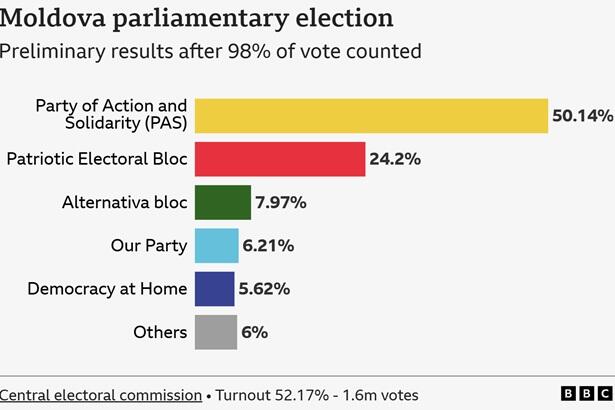 BBC records of the results, “With 99.9% of the 1.6 million votes counted, PAS had 50.17% of the vote – far ahead of the pro-Russian Patriotic Electoral Bloc on 24.18%, Moldova’s central electoral commission said.”