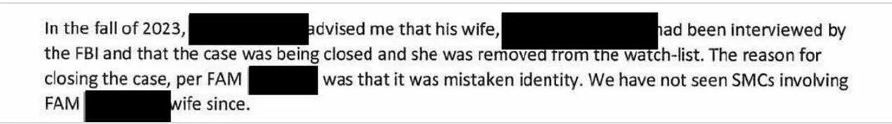 Confirmation that the TSA put Christine Crowder, wife of a Federal Air Marshal and upcoming witness Mark Crowder, under “Special Mission Coverage” due to “association of traveling on the same itinerary as a KST,” or Known or Suspected Terrorist. The TSA mistakenly believed Mrs. Crowder entered the Capitol on January 6th, and eventually conceded the episode was a case of “mistaken identity.”