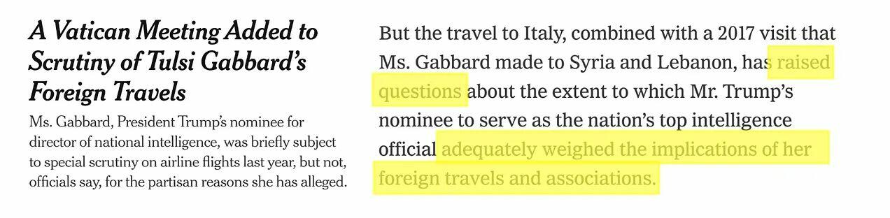 CNN, for instance, wrote “the episode has raised eyebrows among security officials, who point to Gabbard’s history of unusual relationships overseas.” The New York Times waited almost six months, until January of 2025, to say there was no indication Gabbard “did anything wrong” in her overseas trip, but the episode “raised questions about the extent to which Mr. Trump’s nominee to serve as the nation’s top intelligence official adequately weighed the implications of her foreign travels and associations.”