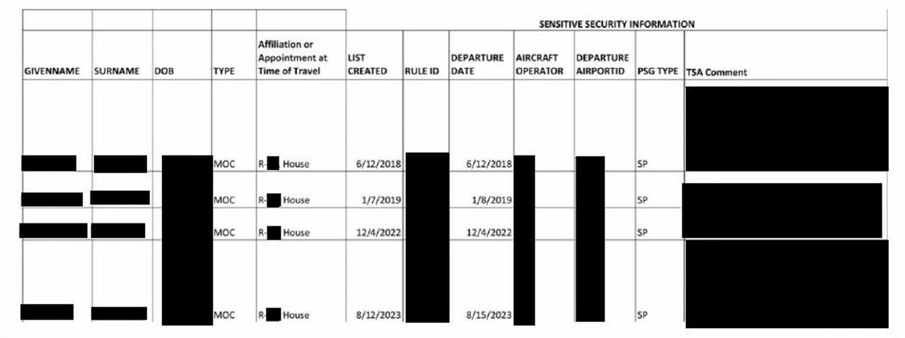 The members’ names have not yet been publicly released, but they were turned over to the Committee by the Department of Homeland Security, along with “TSA” notes explaining how they ended up on the list. Two of the three members made it onto the list before being elected, but as the Committee notes, “a cursory review would have revealed them to be a member of Congress, or a decorated U.S. veteran or service member.” The list below looks like four entries, but the second and third are the same member: