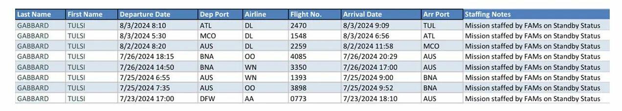 Racket readers will recall a fiasco that spilled into public last August 4th, when UncoverDC (a site run by well-known online journalist Tracy Beanz) ran a story citing travel dates titled “Federal Air Marshal Whistleblowers Report Tulsi Gabbard Actively Under Surveillance via Quiet Skies Program.” When I reached out to Gabbard, she told me “The whistleblowers’ account matches my experience,” and told of a series of intrusive searches dating to July 23, 2024, just after she’d criticized eventual nominee Kamala Harris on The Ingraham Angle, saying she “does not have the strength to stand up to the Military-Industrial Complex.”