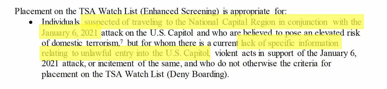 Documentation showing the TSA approved “enhanced screening” and watchlisting for individuals merely “suspected of traveling to the National Capital Region” in conjunction with January 6th, and who are “believed to pose an elevated risk” but for whom “there is a current lack of specific information relating to unlawful entry into the U.S. Capitol”;