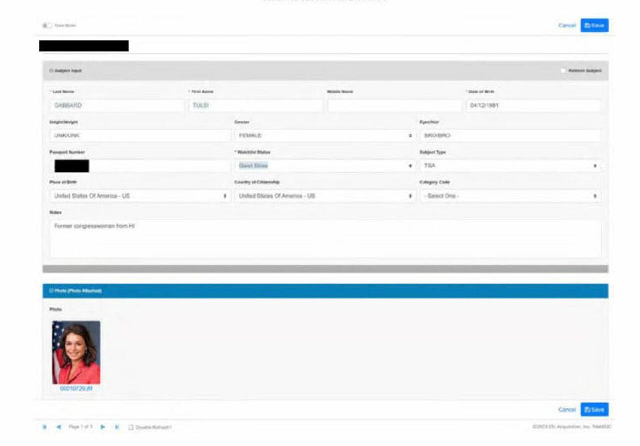 Confirmation that the TSA pulled a web screenshot of Gabbard’s Congressional bio and not an official Passport or other government photo, as would be standard;