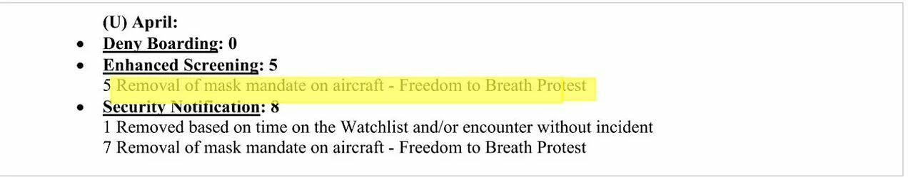 At least 24 people were put into the program for being associated with a group the protested mask mandates, and 12 were placed on a watch list for removing their masks in-flight. The latter act was described in one memo as being “an act of extreme recklessness in carrying out an act that represents a threat to the life of passengers and crew”;