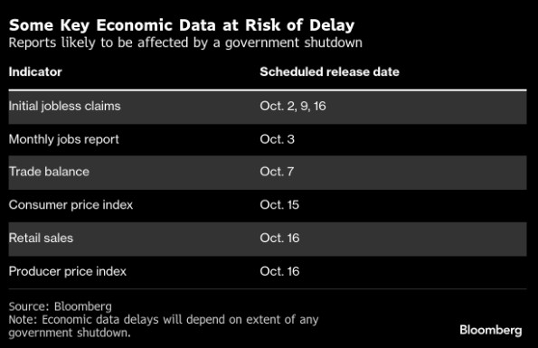 Shutdowns create an additional headache for the Fed: data blackouts. If the government shuts down on Oct. 1, the release of initial jobless claims scheduled for Oct. 2 and the September payrolls report on Oct. 3 would likely be delayed. A prolonged closure could also push back key October releases, including the consumer price index (Oct. 15), retail sales (Oct. 16) and the producer price index (Oct. 16).