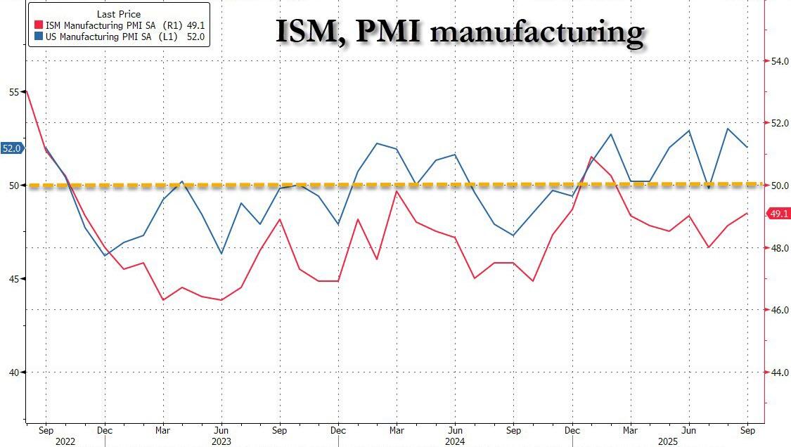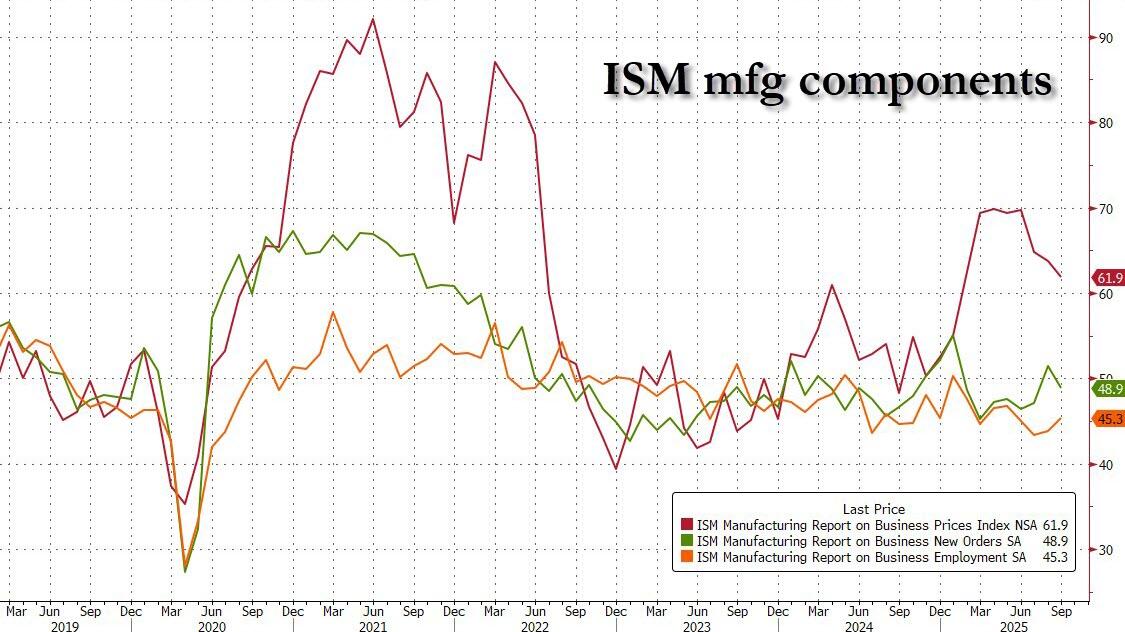 Under the hood, we saw a continuation of recent trends, as priced paid fell again, this time dropping to 61.9, from 63.7 and below the 62.7 est. This was the lowest print since February (i.e., before Liberation day). Meanwhile, New Orders also declined, sliding into contraction territory (from 51.4 to 48.9), although the improvement in the Employment indicator was probably the most important metric, because coming after the atrocious ADP print, the rise from 43.8 to 45.3, and above the 44.3 estimate, will probably help set some traders at ease that the labor market isn’t completely collapsing.