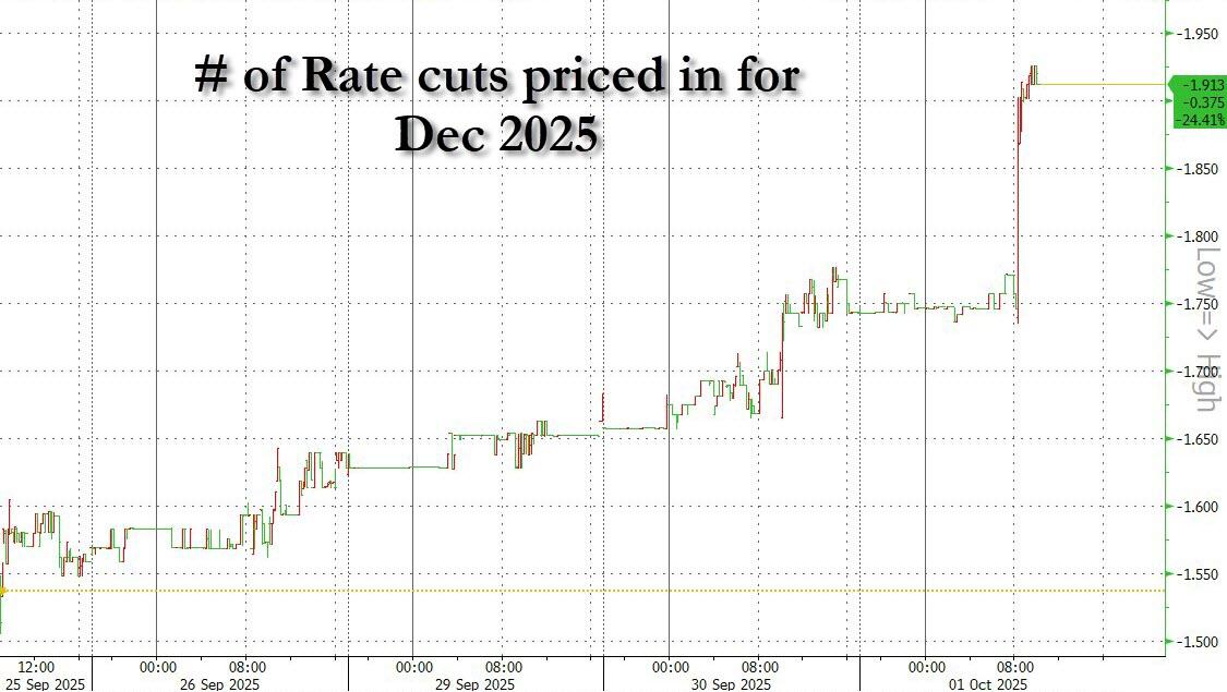 After this morning’s shockingly bad ADP print, which printed negative for the 3rd time in the past 4 months, was a six-sigma miss to estimates, and which sent market-implied rate cuts odds for December to nearly 2 from 1.75 earlier in the day…