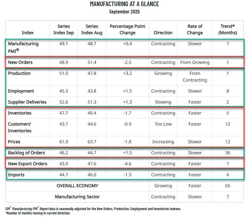 “The overall economy continued in expansion for the 65th month after one month of contraction in April 2020” said Susan Spence, Chair of the Institute for Supply Management. “In September, U.S. manufacturing activity contracted at a slightly slower rate, with production growth the biggest factor in the 0.4-percentage point gain of the Manufacturing PMI. However, the combined drops in the New Orders and Inventories indexes (4.2 percentage points) exceeded the increase in the Production Index (3.2), rendering the Manufacturing PMI improvement negligible. Last month’s increase in new orders (an index gain of 4.3 percentage points from July to August) seems to have flowed through to production but does not appear to be sustainable given the subsequent drop in new orders in September.