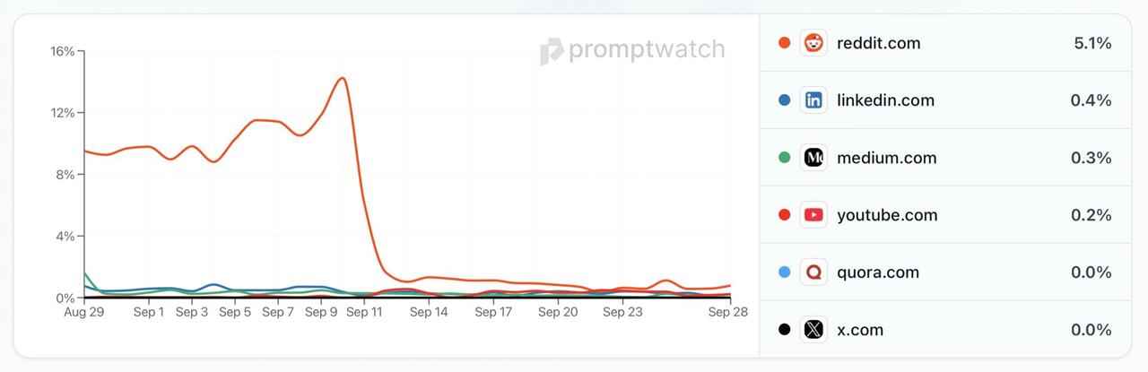 Apparently ChatGPT is not using Reddit much anymore for their answers. I guess they realized that what random people say can’t be considered a trusted source after all. You can all stop spamming it with your fake brand mentions now.