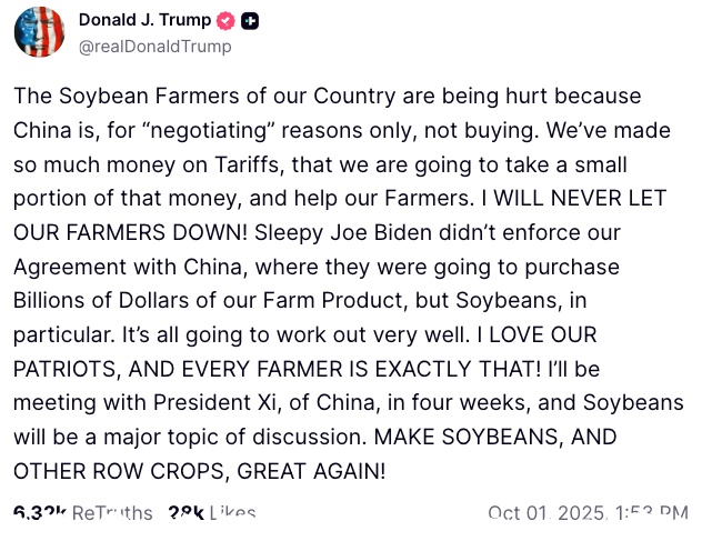 Trump noted in the Truth Social post above that he will be meeting with Chinese President Xi Jinping in four weeks and will make Soybeans a “major topic of discussion.”