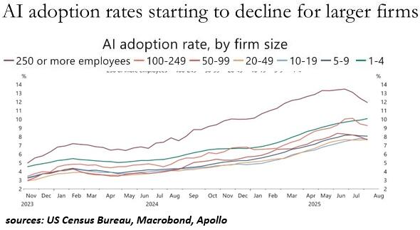 3. The rate at which major companies are adopting AI is rolling over. This chart reflects the peak of euphoria has been reached by those with the most resources to figure that out and the real-world utility of AI tools is yet to be determined.