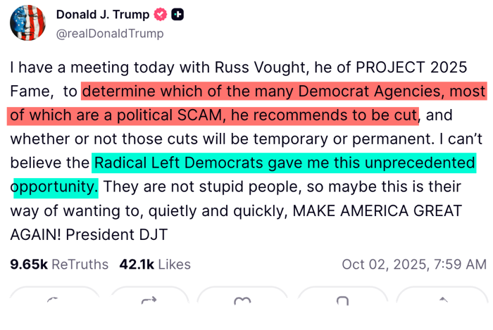 On Thursday, President Trump wrote on X that he was meeting with OMB Director Vought “to determine which of the many Democrat Agencies, most of which are a political SCAM, he recommends to be cut, and whether or not those cuts will be temporary or permanent.”