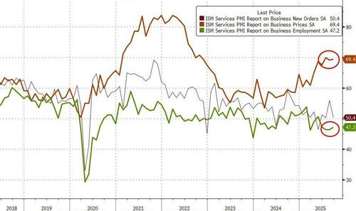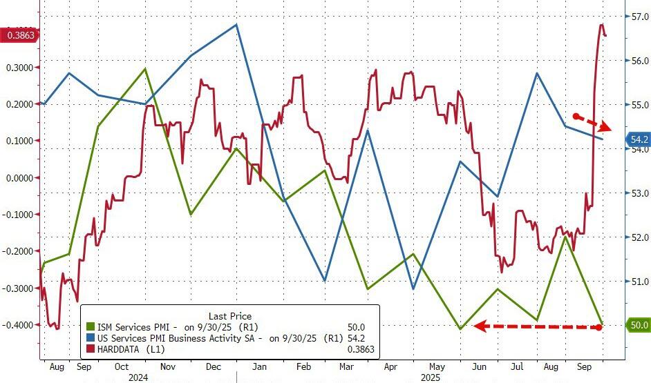 With ‘hard’ data surging higher, S&P Global’s US Services PMI rose from 53.9 preliminary to 54.2 final in September (but that is down from the 54.5 final print for August). The ISM Services PMI also fell MoM from 52.0 to 50.0 (worse than the 51.7 expected) – that is the weakest since May…