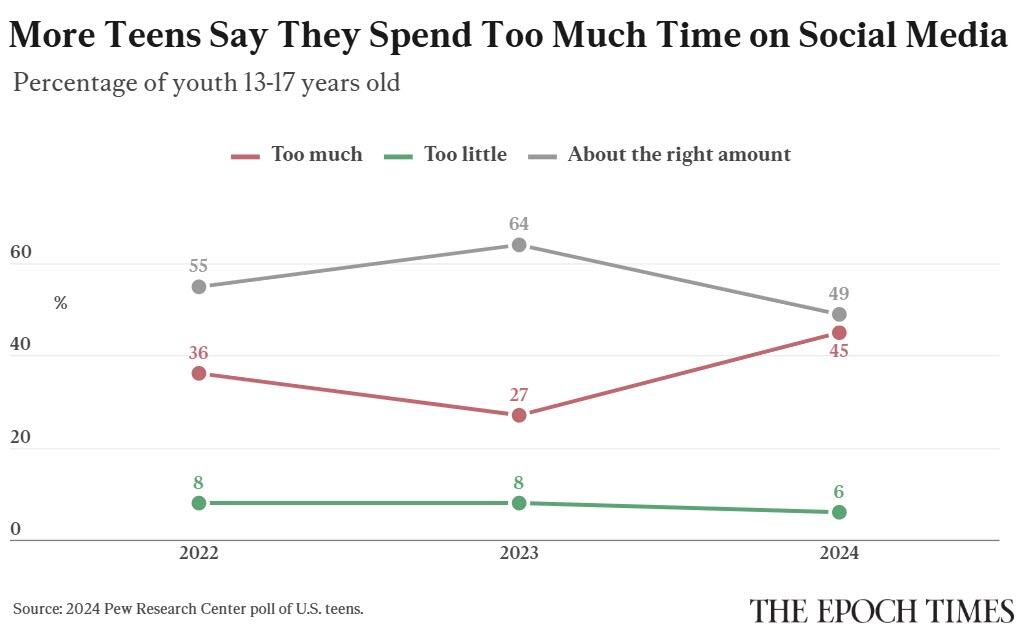 But almost half of teenagers said in a Pew Research poll last year that they spend too much time on social media, up from only about a quarter in 2023.