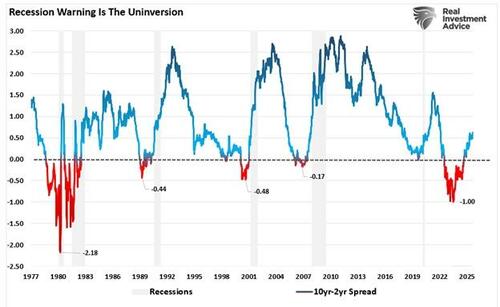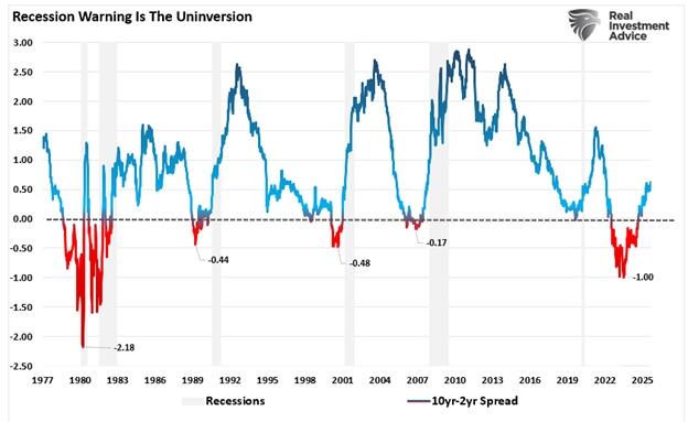 History tells us that a recession almost always follows when the yield curve inverts, well, technically, it is when it UN-inverts. Nonetheless, since the 1960s, every sustained inversion has been followed by an economic contraction, sometimes quickly, sometimes with a lag. The inversion that began in 2022 was the deepest and longest we’ve ever experienced. If that signal still carries weight, it is logical that we should expect economic weakness to emerge.