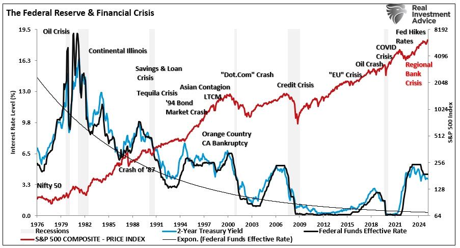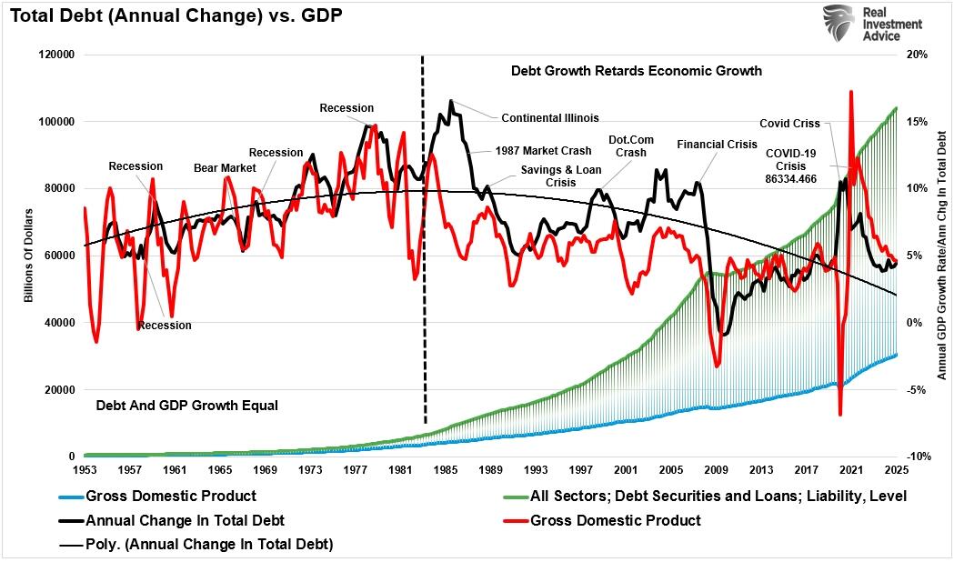 Meanwhile, government deficits have poured unprecedented amounts of cash into the system outside of a crisis period. Infrastructure projects, industrial policy initiatives, and entitlement spending have all provided ongoing support. In effect, Washington has been running “emergency stimulus” permanently, which has kept normal recessionary factors from occurring.