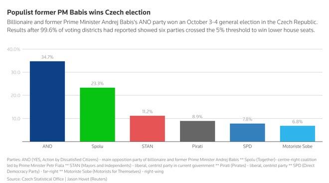 An ebullient Babis, also known as the Czech Trump – for being a septuagenarian billionaire campaigning on a populist message and passing out red caps to ardent supporters – told supporters that ANO would seek a one-party cabinet but would talk with two small parties – including the far-right SPD – for support as his party will lack an outright majority. He again rejected accusations that his win would make the central European nation a less reliable European Union and NATO partner.