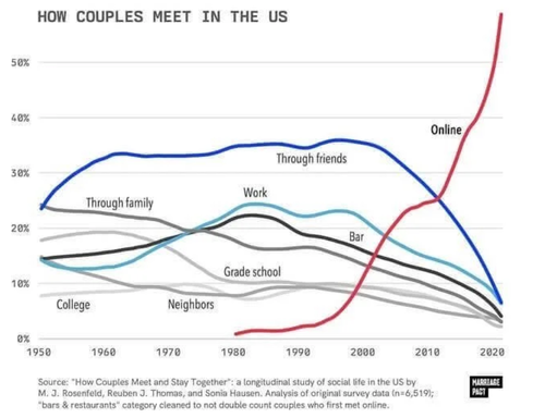 For half a century, how couples met in America was primarily shaped by family and friend networks, communities, churches, colleges, and workplaces – you know, just the traditional fabric of Western society. However, the advent of the internet and the rise of Big Tech, with its closely guarded algorithms (and now AI bots), have dramatically reshaped modern romance. Yet, new data from Goldman suggests that how couples meet, whether online or through dating apps, may have reached a major inflection point.
