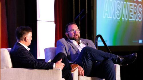 Tim Hampton, left, general manager and senior vice president of WEX over-the-road and WEX Capital, and Derek Leathers, the chairman and CEO of Werner, during the presentation, “State of the Road: Navigating the Economy and Opportunities Ahead” on Thursday
