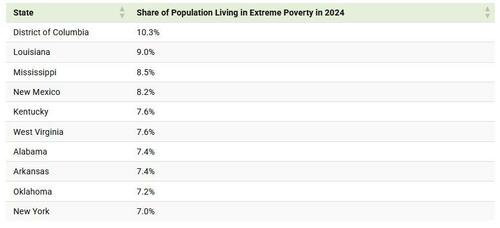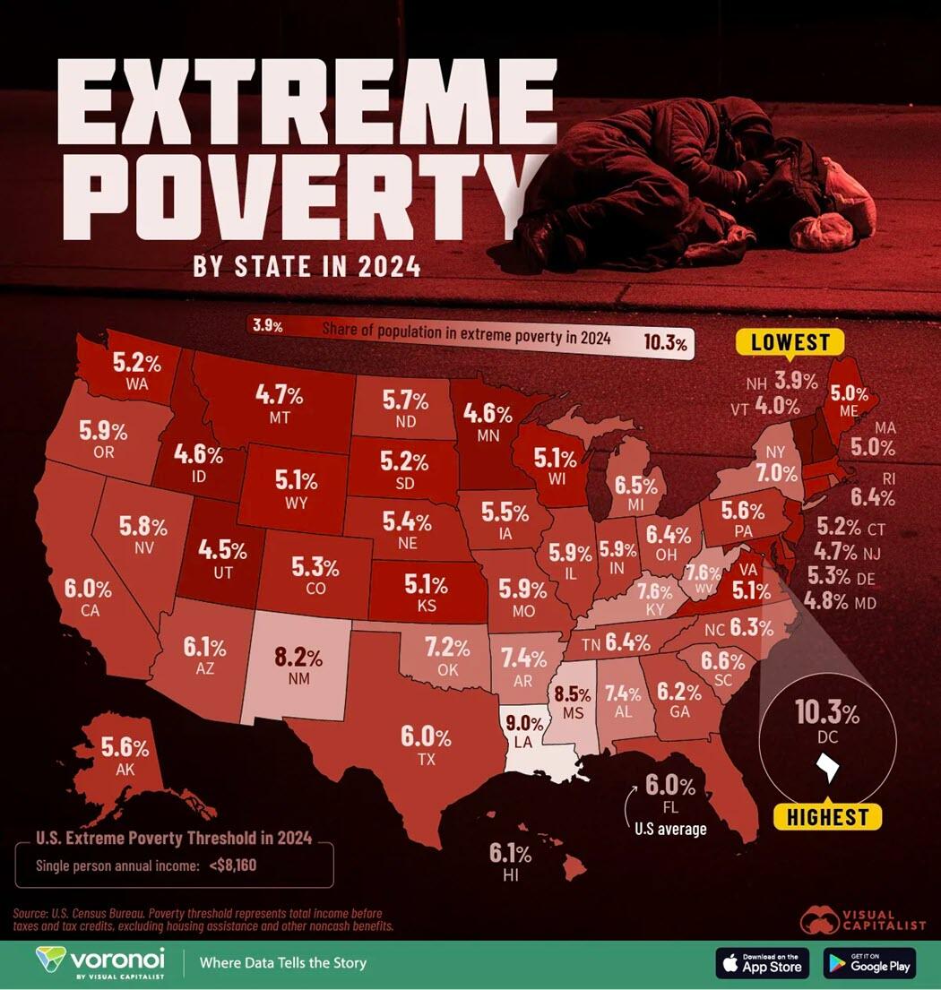 This graphic, viaVisual Capitalist’s Dorothy Neufeld, shows the share of each state living in extreme poverty in 2024, based on data from the U.S. Census Bureau.