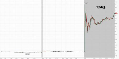 13 minutes later it was official: the US said it will take a 10% stake in Canadian minerals explorer Trilogy Metals as part of a $35.6 million investment to secure critical energy and mining projects in Alaska. The US deal also includes warrants to purchase an additional 7.5% of the Vancouver-based company.
