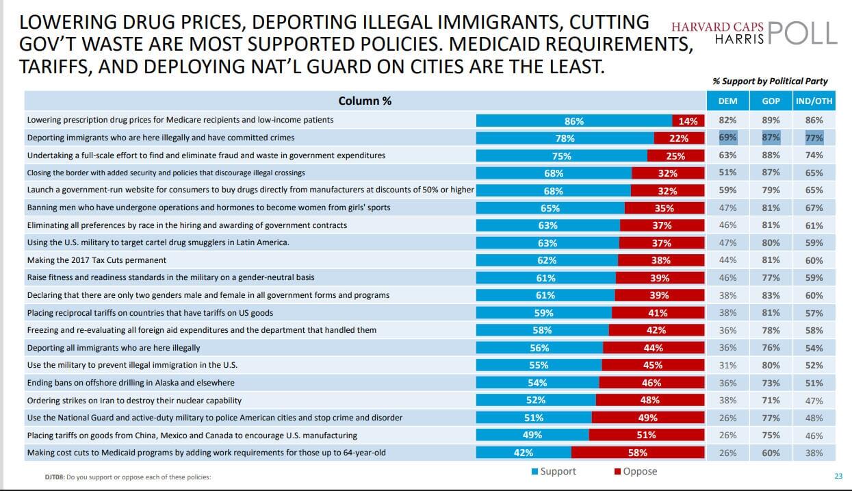 President Trump’s policy of deporting criminal illegal aliens is his second most popular policy according to the Harvard Caps/Harris poll, just under lowering prescription drug prices for Medicare recipients and low income patients.