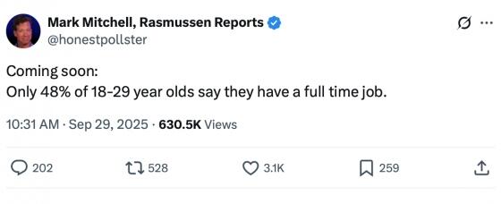 According to Mark Mitchell, a Rasmussen Reports survey that will soon be released will show that only 48 percent of U.S. adults under the age of 30 currently have a full-time job…