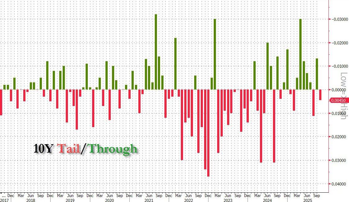 The note priced at a high yield of 4.117%, up from 4.033% in Sept, but except for that one month, it was the lowest since Oct 2024. The auction also tailed the 4.114% When Issued by 0.3bps, following last month’s stop and was the 2nd tail in the last 8 auctions.