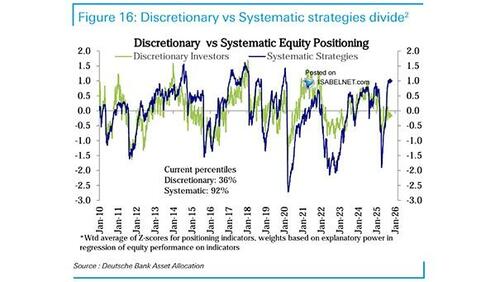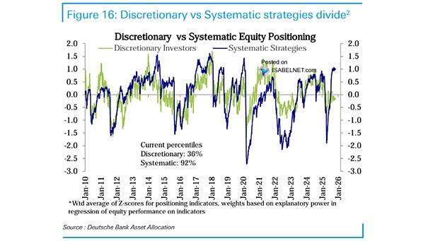 Furthermore, systematic flows had increased equity exposure, reinforcing a feedback loop of rising prices and falling volatility. Many algorithmic trading strategies are volatility-sensitive; therefore, when markets trend upward with low volatility, these strategies increase exposure. This creates a feedback loop where price action drives further buying.