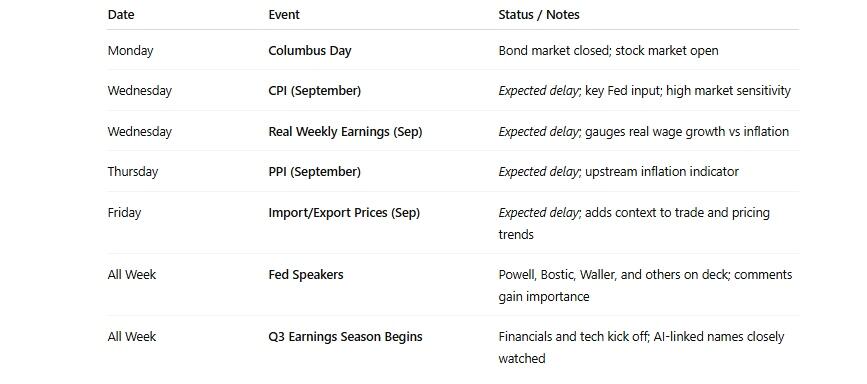 The economic calendar for the upcoming week was expected to provide critical updates on inflation and wage growth. However, due to the ongoing government shutdown, the release of major reports from the Bureau of Labor Statistics and the Census Bureau is uncertain. If not resolved by early next week, most federal economic data, including CPI and PPI, will be delayed. That removes essential guidance at a time when investor positioning is heavily dependent on a soft-landing narrative.