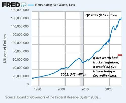 If net worth had tracked inflation, total net worth would be $76 trillion, not $167 trillion. This suggests net worth could fall by half and still have registered gains from 2001.