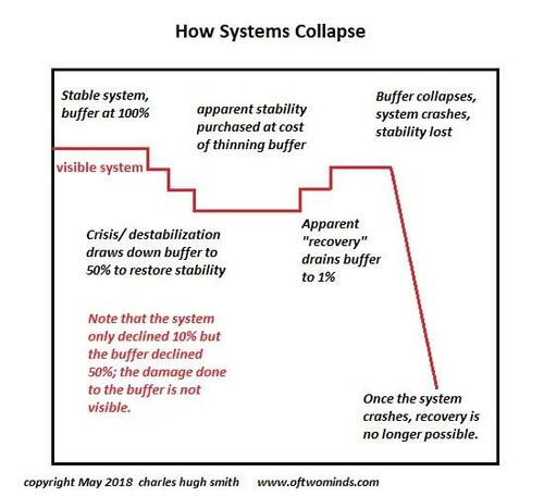 Those with the thinnest buffers may well experience the recession as a Depression. In maintaining the illusion of “growth” and “wealth,” we’ve thinned the system’s buffers to the point where any shock will collapse structures that looked solid because maintaining the appearance of stability was the entire point.