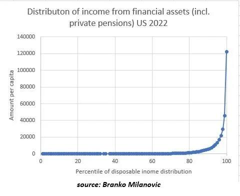 According to economist Branko Milanovic, who studies wealth and income inequality, the median annual per capita income from financial assets in the U.S. is $21.89. Yes, $22, enough for a few Happy Meals.