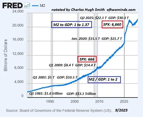 Money supply has expanded faster than the economy, as has debt, as reducing interest rates encourages more borrowing which then inflates assets, generating “the wealth effect” when then boosts more borrowing and spending, a so-called virtuous cycle of expanding debt based on assets expanding in value, enabling even more debt.