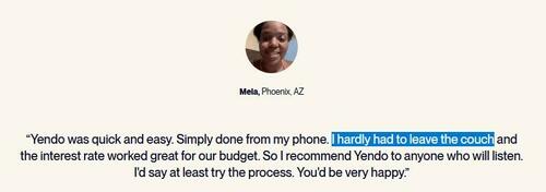Mela from Phoenix, AZ “hardly had to leave the couch” to tap into her car’s equity. And apparently one of the highest interest rates on the planet “worked great” for her budget.