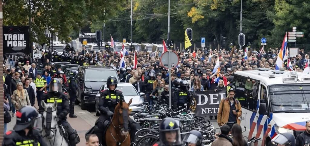 A similar rally held last month in The Hague ended in violence, with protesters setting police cars on fire, attacking the office of left-wing party D66, and pelting police with bottles.