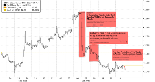 Ford shares have dropped about 10% on the Oswego fire and the resulting production cuts or halts of five vehicle lines. Year-to-date, shares are up 16.5%.