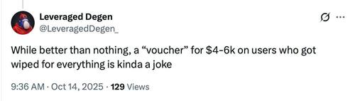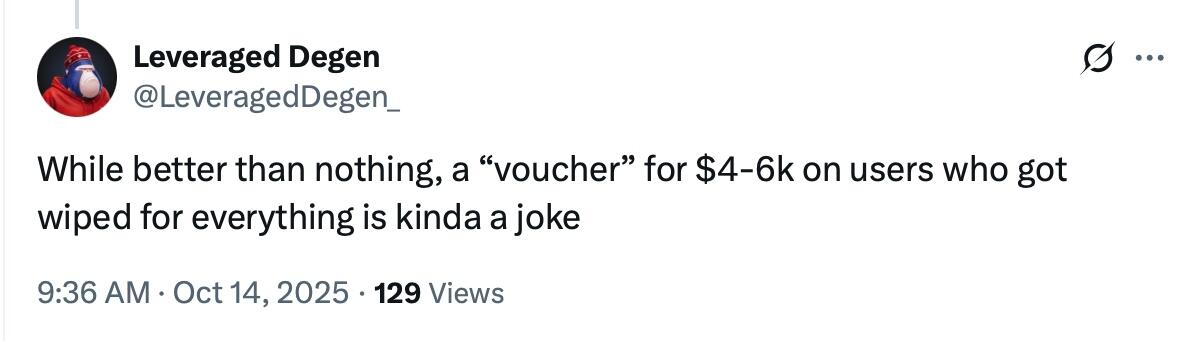 Others said the reimbursements were welcome but fell short of covering the weekend’s losses. “While better than nothing, a ‘voucher’ for $4 to $6k on users who got wiped for everything is kinda a joke,” LeveragedDegen wrote.