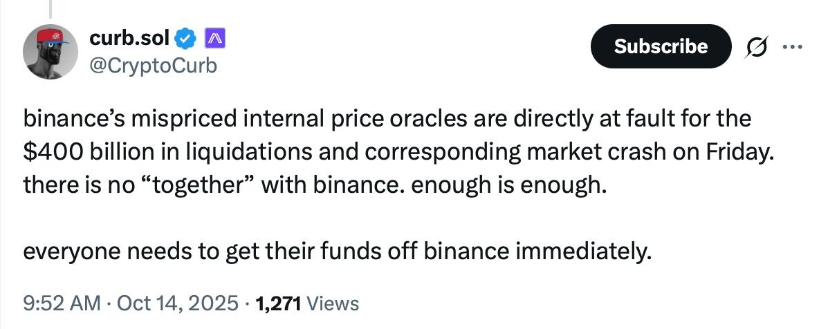 In contrast, user Curb.sol wrote that Binance’s “mispriced internal price oracles are directly at fault for the $400 billion in liquidations and corresponding market crash.” Adding, “everyone needs to get their funds off Binance immediately.