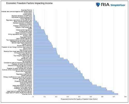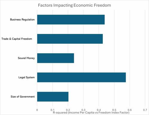 As we wrote earlier, the Economic Freedom Index is divided into five main categories, which are comprised of 60 subcomponents. To better quantify the importance of these factors, we calculated the R-squared values (statistical significance) for all of them in relation to per capita income.