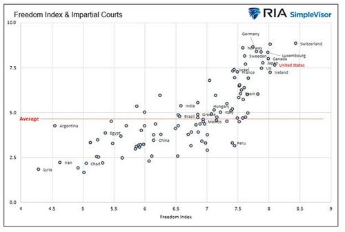 Connecting the dots, we found that a nation’s court system and level of justice have the most significant impact on its Freedom Index, and therefore, by extension, on the wealth and happiness of its citizens.
