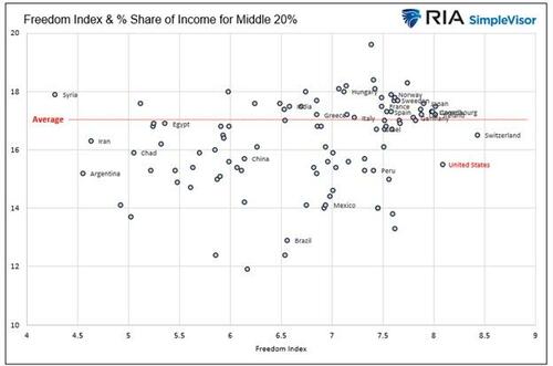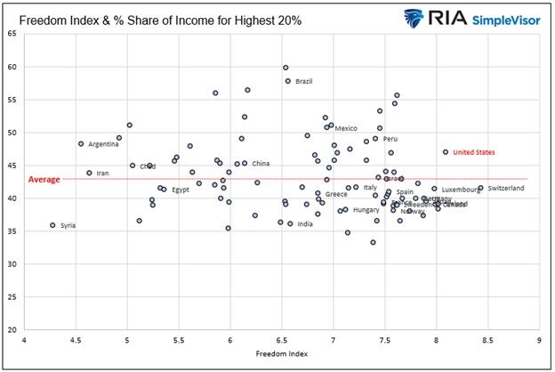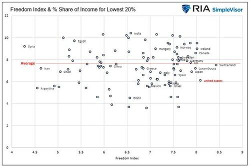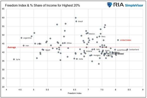 For instance, the wealth gap in the United States shows up in these graphs. The top 20% of income earners in the US are above the average for countries with a Freedom Index of 7.0 or higher, while the middle and lowest groupings are below the average.