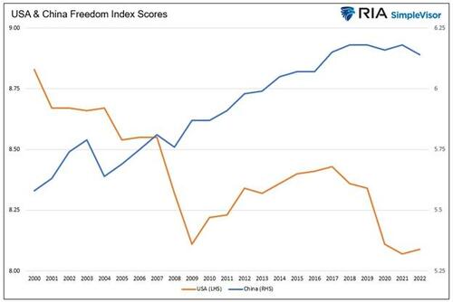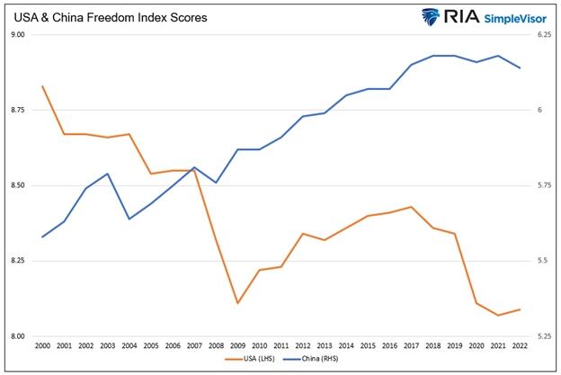 Meanwhile, China, which is slowly shifting from communism toward capitalism, has seen its Freedom Index score steadily improve. Note that the graph uses two axes, which can be a little misleading. The US still has a much higher Freedom Index score than China.